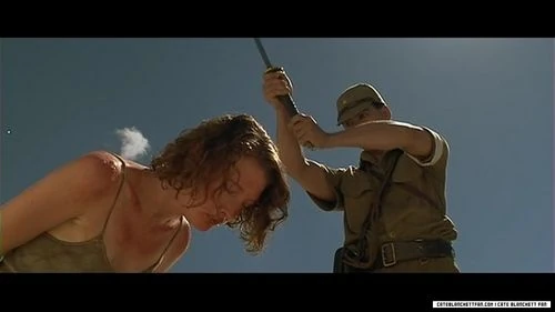 In 1997, the sword beheading was used in the WW2 movie Paradise Road for the scene where Australian nurse Susan Macarthy, played by Cate Blanchett, is executed for being insolent to the Japanese guards at the POW camp where the movie is set. The moment of her beheading was shot in close-up, and clearly shows the sword passing through her neck and her head beginning to fall to the ground.